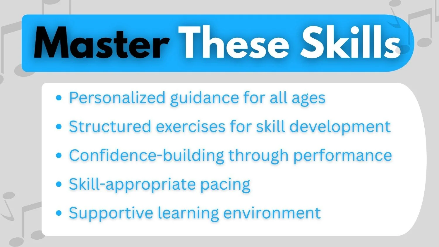 Each student progresses at their own speed, ensuring they develop the ability to play accurately without feeling rushed.