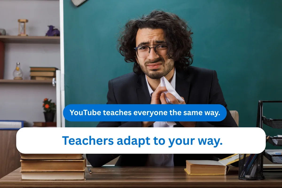 Everyone learns differently. Some are visual learners, others need to hear or physically try it. YouTube videos are one-size-fits-all. In contrast, music teachers adapt lessons vs forcing you to fit a generic method.